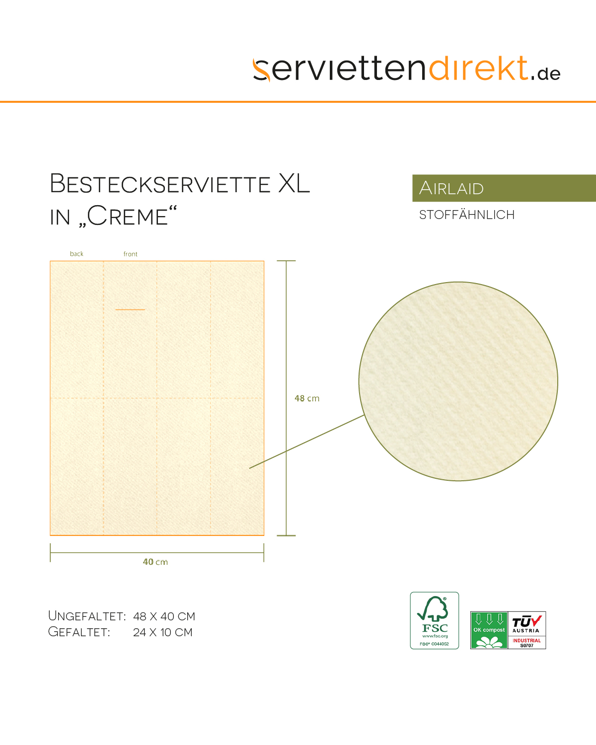 XL Airlaid Serviette in Creme, 48 x 48 cm, 1/4 Falz, 50 Stück - Mank