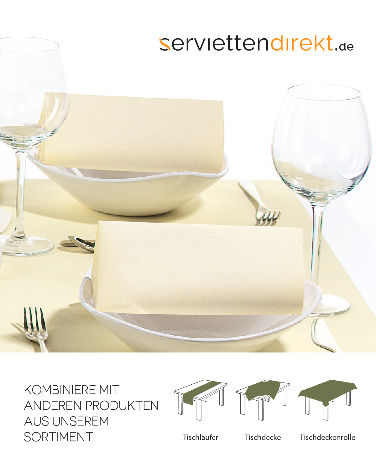 Klassisch und zeitlos sind Dekorationen mit Tischprodukten unseres Farbtons CREME. Der zarte Farbton ist der ideale Begleiter für festliche Anlässe. Solo oder in Kombination mit weiteren Produkten unseres Sortiments, ergeben sich so elegante und stilvolle Tischgestaltungen.