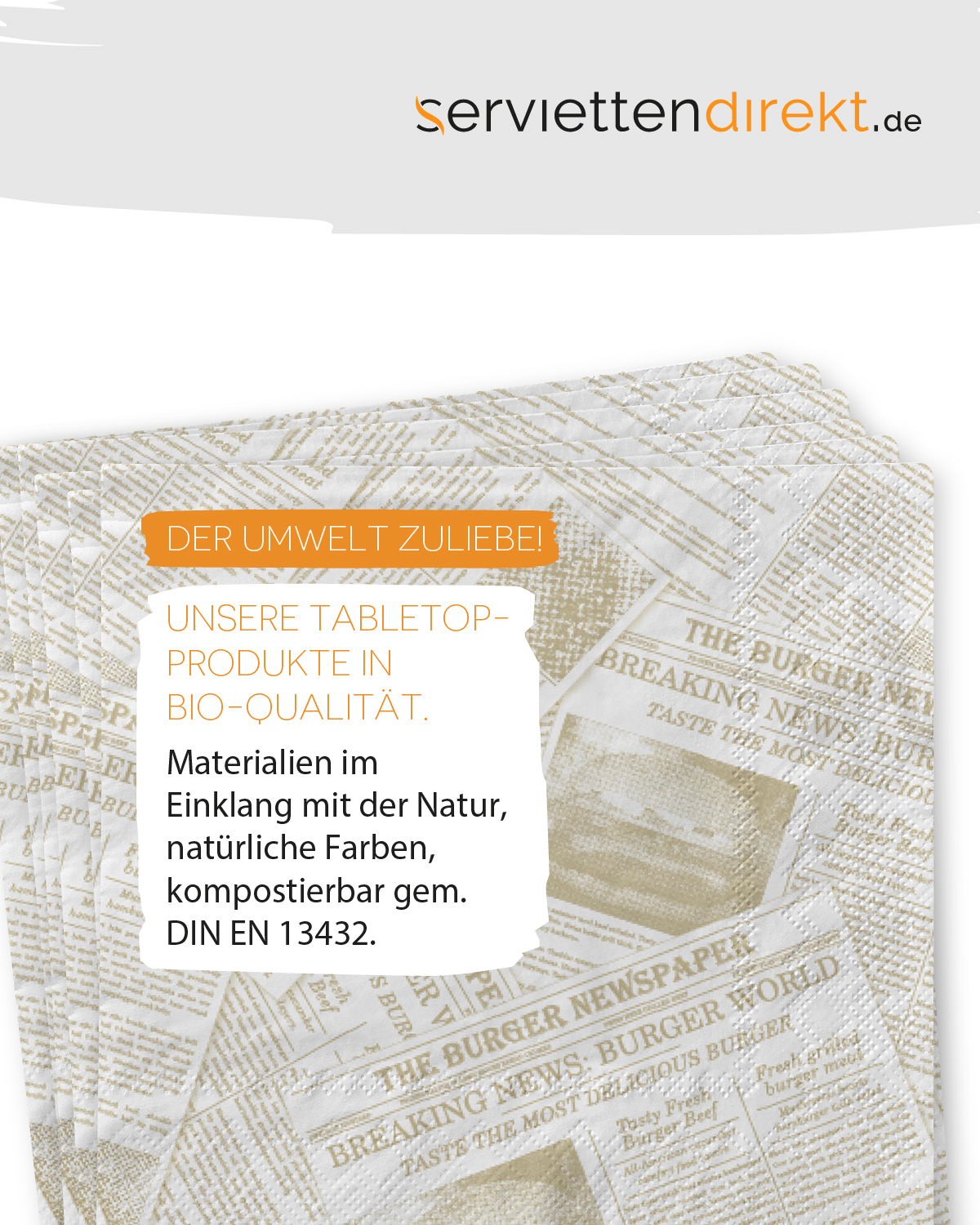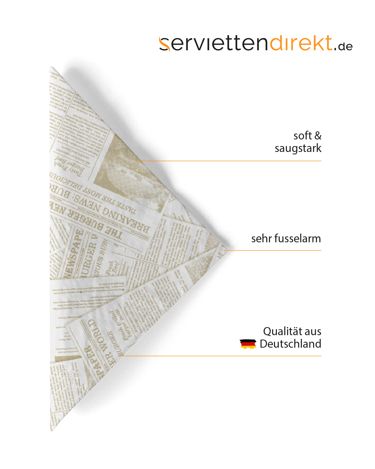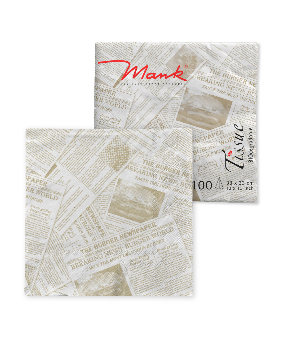 Breaking Burger News! Hier steht ihr bProdukt im Fokus, denn das klassische Newspaper Design ist die moderne Verpackungs- und Service-Alternative für Burger und Co, deren ursprüngliches Verpackungsmaterial in den 50er Jahren aus Zeitungen bestand. Setzen Sie auf ein trendstarkes Table Top Design, dass Ihre Gäste begeistern wird! Ob Diner, Craft-Burger Restaurant oder Streetfood-Truck – die Tissue Servietten im Newspaper-Design sind ideal für einen modernen Service, der dem Produkt angepasst ist. Aus hochwertigem Tissue in softer, dreilagiger Qualität gefertigt, sind sie die Allroundlösung für jede Gelegenheit!