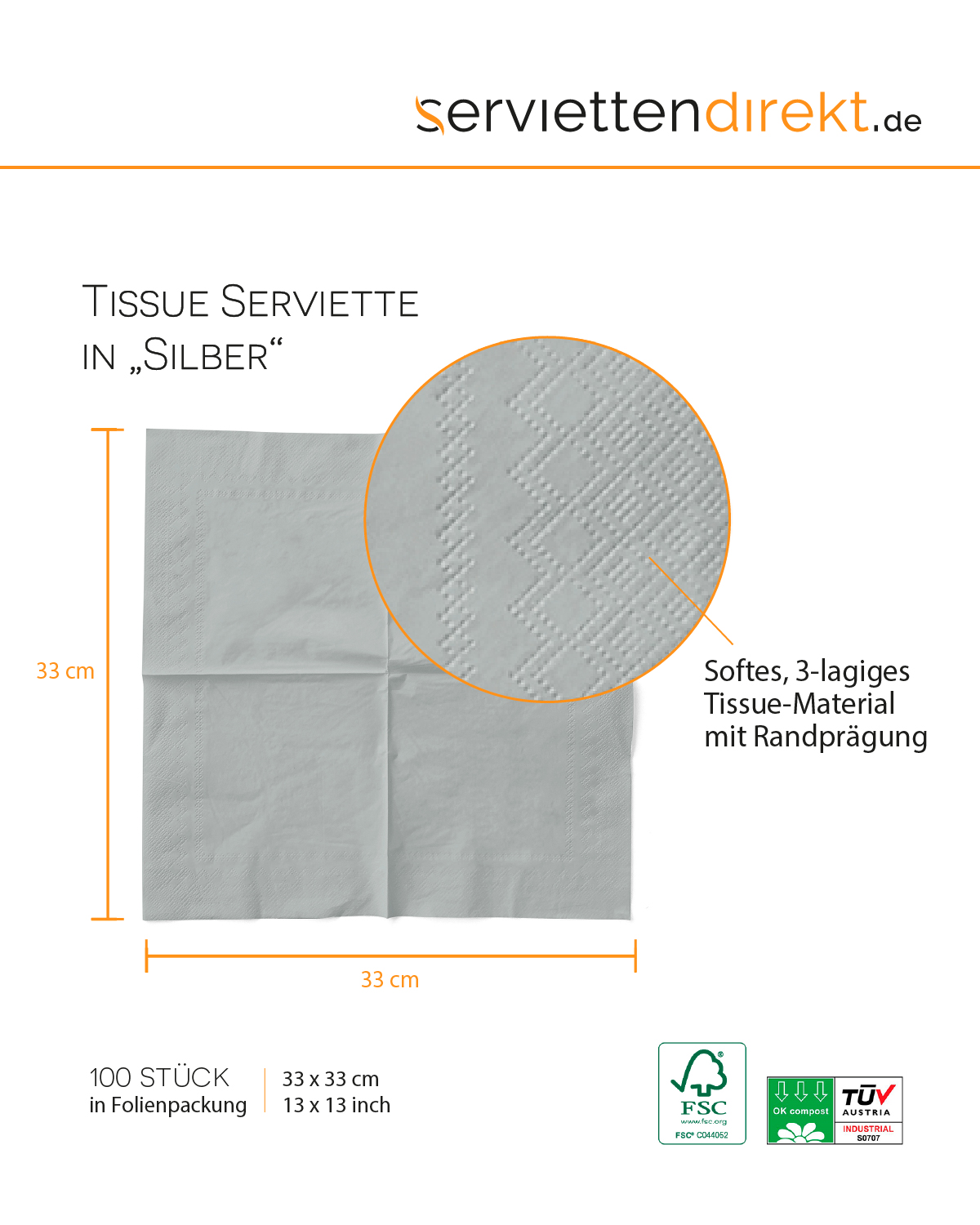 Die Tissue Serviette in SILBER ist die ideale Wahl, um Ihrem Event eine elegante und zeitlose Ausstrahlung zu verleihen. Mit einer praktischen Größe von 33 x 33 cm und dem klassischen 1/4-Falz-Design ist diese dreilagige Serviette in einer Packung mit 100 Stück erhältlich. Das hochwertige Tissue-Material sorgt für eine weiche Haptik und exzellente Saugfähigkeit, was sie perfekt für gehobene Anlässe wie Hochzeiten, festliche Dinner oder elegante Empfänge macht.