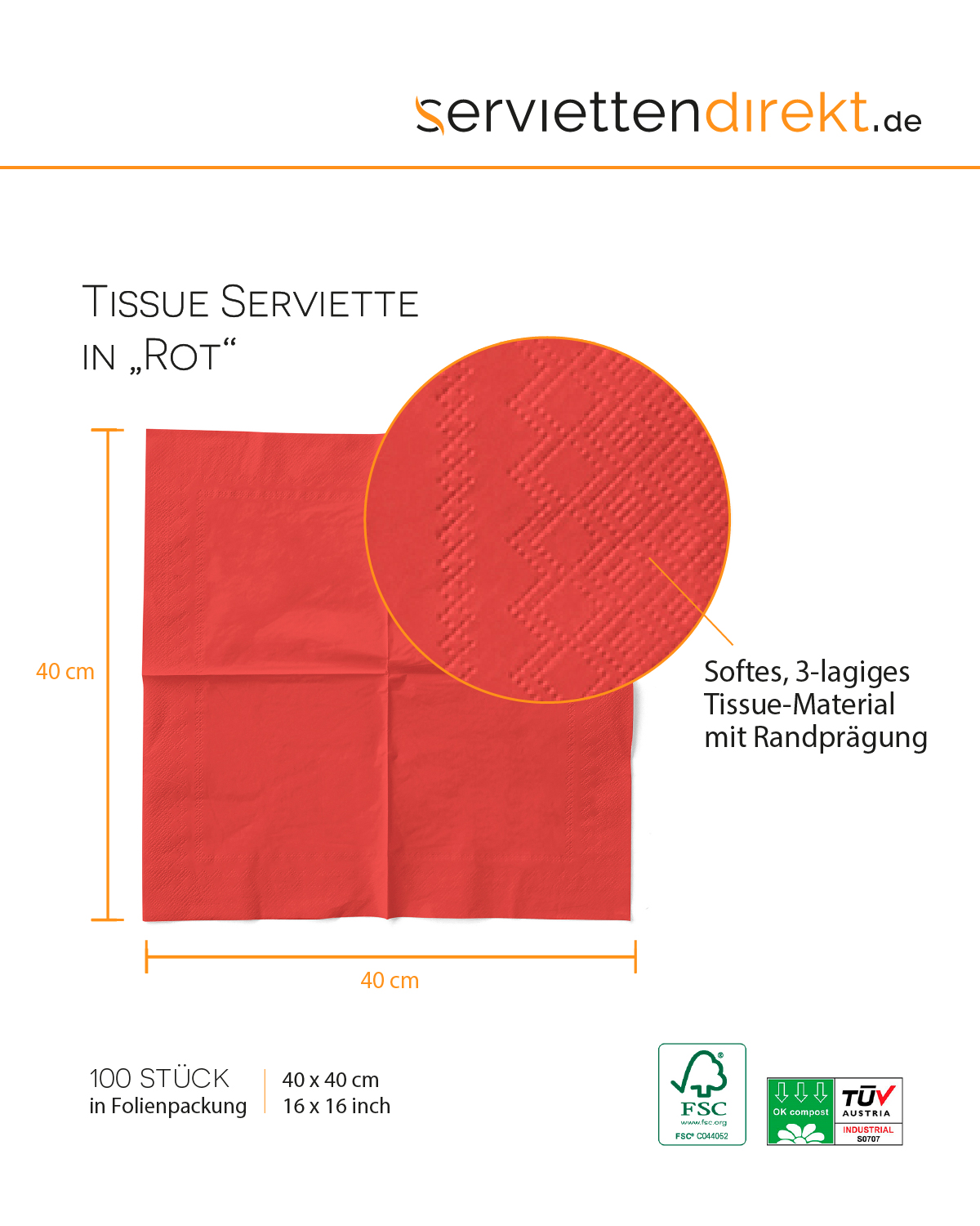 Tissue Serviette Rot, 40 x 40 cm, 1/8 Falz, 100 Stück - Mank