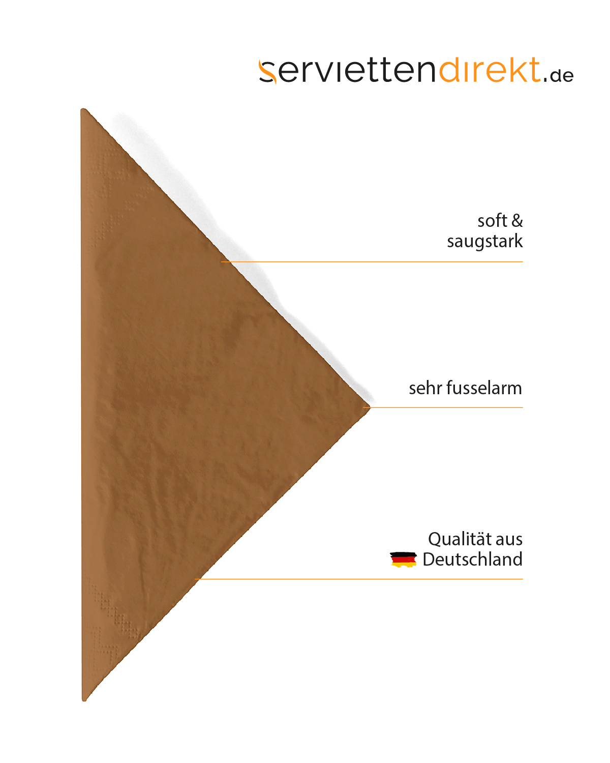 Einen festlichen Auftritt haben unsere Tischprodukte in der Farbe BRONZE denn sie setzen glanzvolle Akzente in Ihrer Tischdekoration und untermalen so stilvoll jeden feierlichen Anlass. Kombinieren Sie unsere Tischprodukte in der Farbe BRONZE mit weiteren Produkten unseres unifarbigen Sortiments, für einen glänzenden Eindruck! Unsere Servietten aus hochwertigem Tissue sind moderne Allrounder für nahezu jede Service-Situation. Das aufwendig hergestellte, dreilagige Material ist saugstark und reissfest, ideal für den Barbetrieb, FrühStücksservice oder das Cafe.