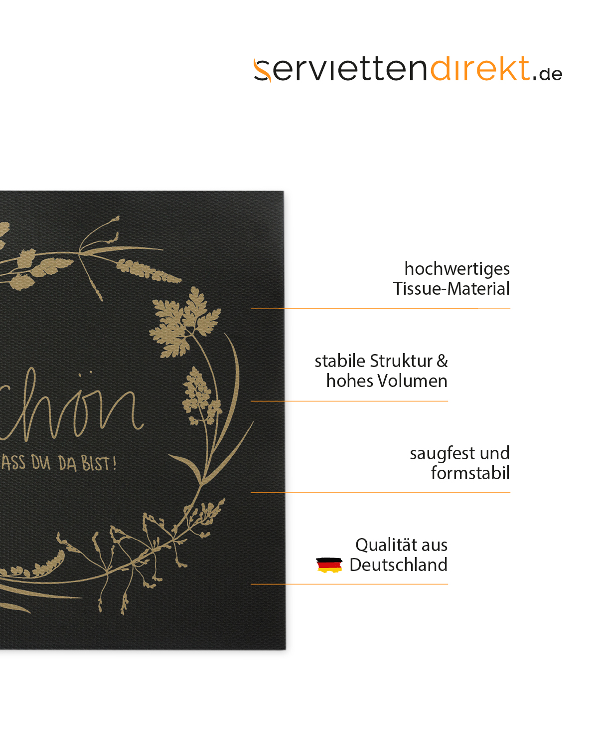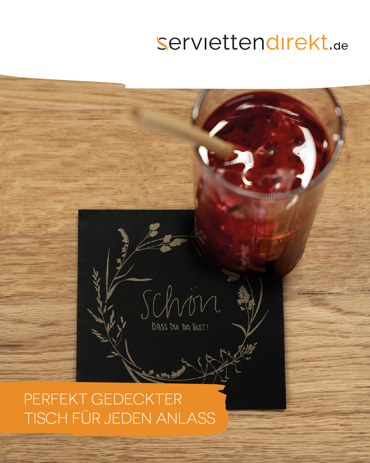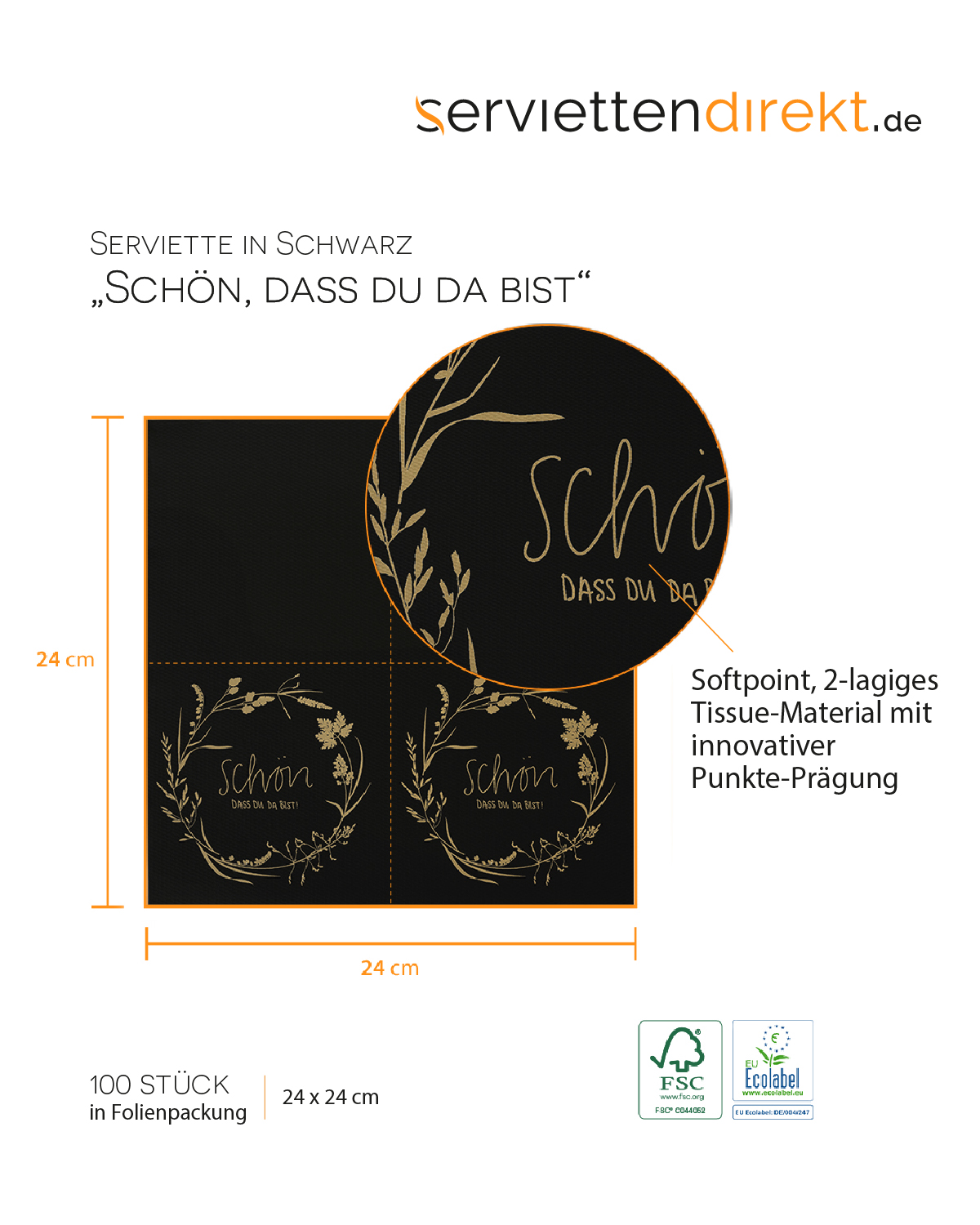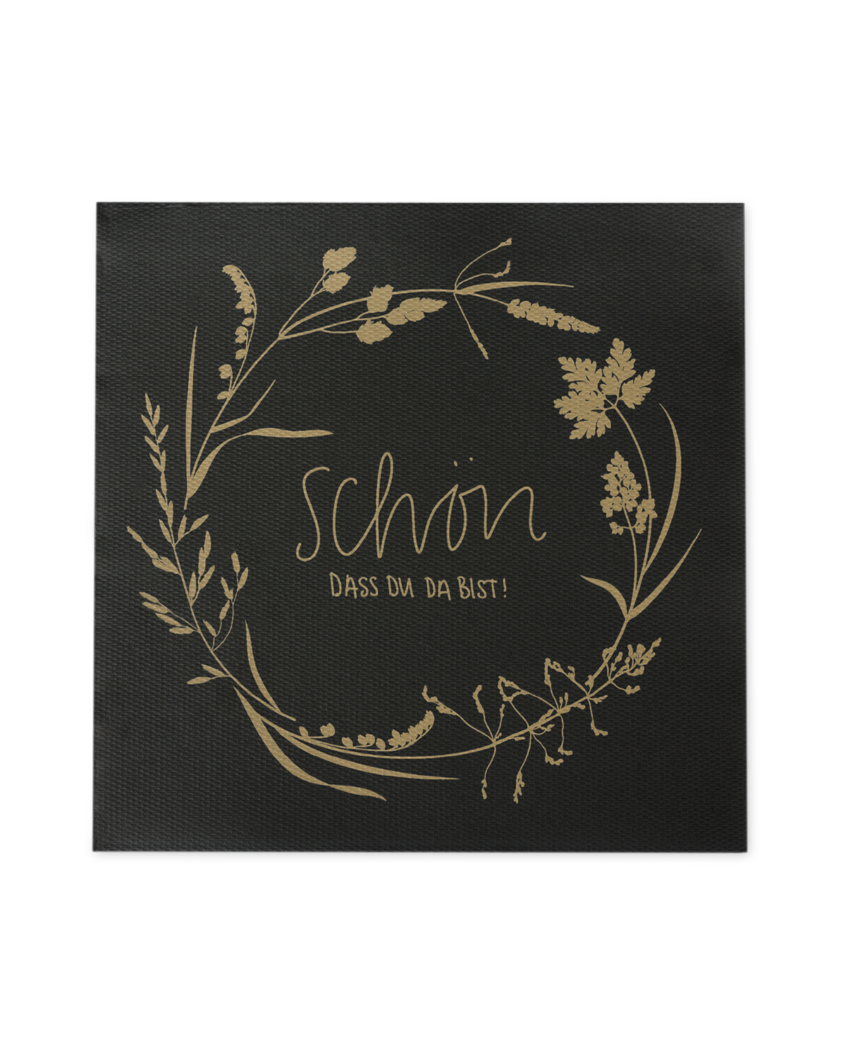 Die Softpoint Cocktail-Serviette „SCHÖN, DASS DU DA BIST“ kombiniert Funktionalität und elegantes Design auf stilvolle Weise. Mit einem charmanten Schriftzug im Blumenkranz auf einem tiefschwarzen Hintergrund setzt diese Serviette besondere Akzente und verleiht Ihrem Café oder Barbetrieb ein ansprechendes Ambiente.