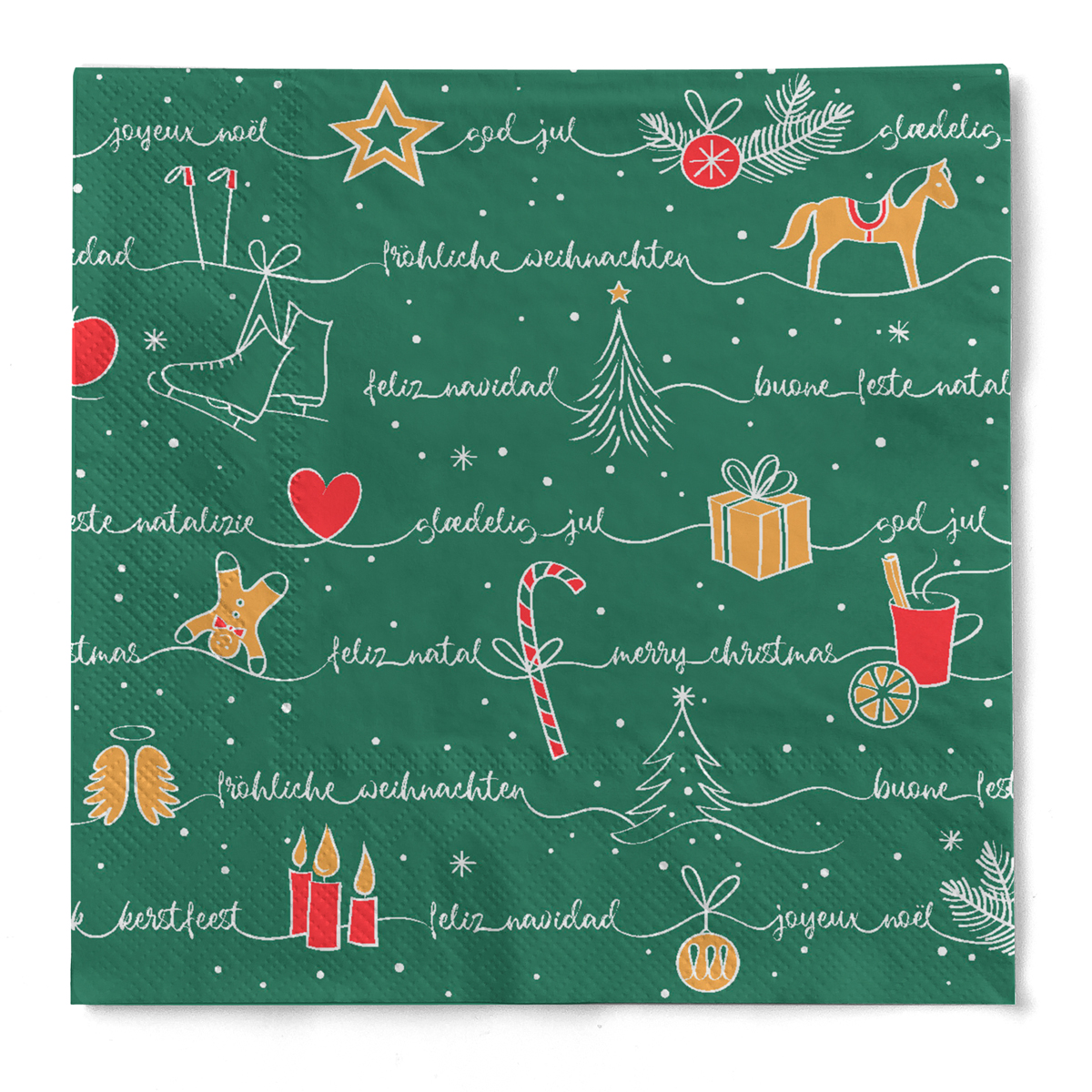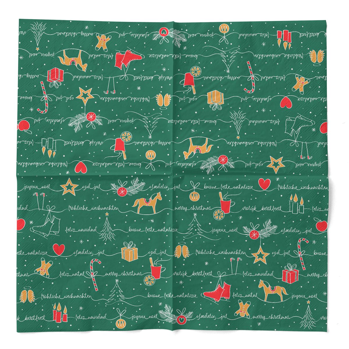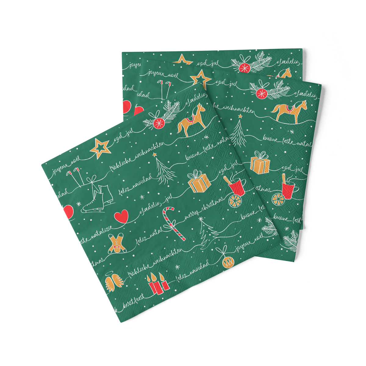 Die Mank Tissue Serviette Ravin in den klassischen Weihnachtsfarben Grün, Rot und Gold sorgt für eine stimmungsvolle Tischdekoration während der Advents- und Weihnachtszeit. Ob beim gemütlichen Familienessen, Weihnachtskaffee oder auf der festlich gedeckten Firmenfeier – diese Servietten verleihen jeder Tafel sofort festliche Eleganz.